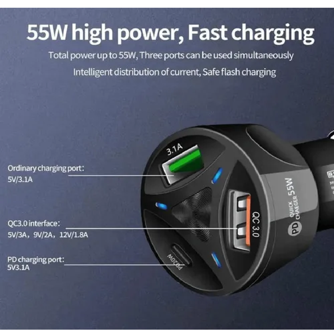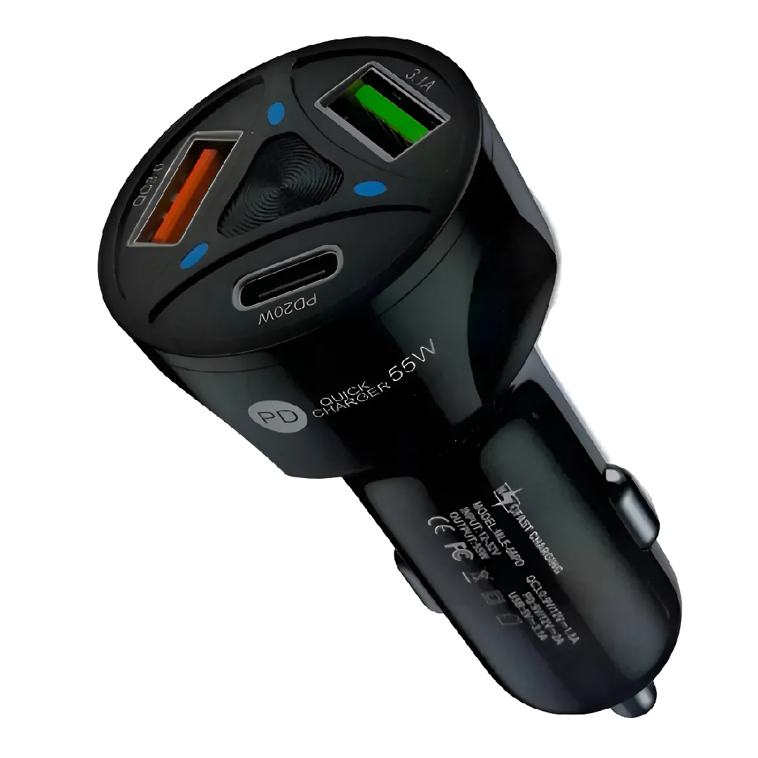 El Cargador de Auto con Tecnología Qualcomm Quick Charge 3.0 y Power Delivery (PD) es un dispositivo diseñado para proporcionar carga rápida y eficiente a una amplia gama de dispositivos electrónicos mientras se está en movimiento. Equipado con tres puertos—dos USB y uno Tipo C—este cargador permite la carga simultánea de múltiples dispositivos sin comprometer la velocidad o la eficiencia.
